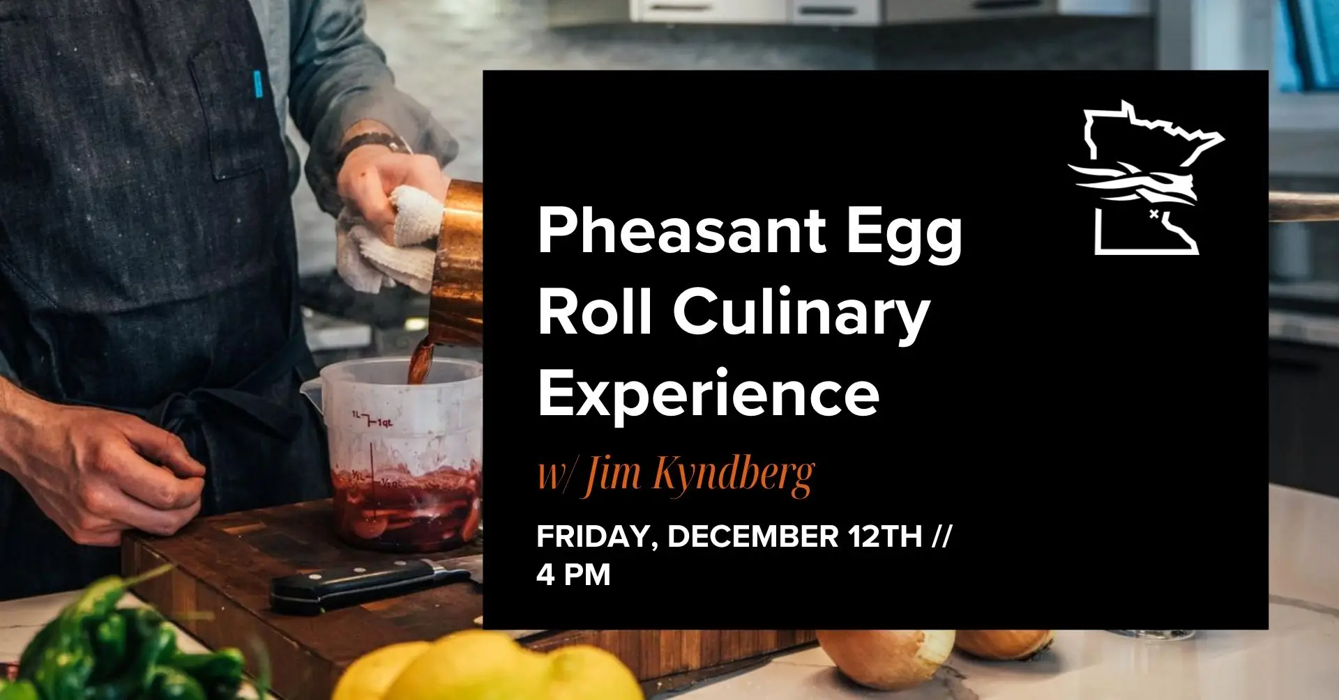 Jim Kyndberg by preparing your own hand-rolled pheasant egg rolls with hot & sour soup garnished with puffed wild rice. Guests will learn preparation process, tips for handling game meat in everyday cooking, and enjoy freshly cooked samples hot from the pan.